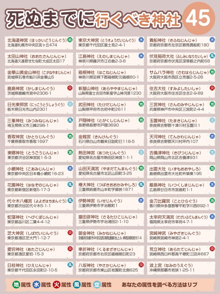 去日本除了血拼吃美食,別忘了幫心靈充電!為你完整翻譯日本社群瘋傳的「死前必去 45 間神社」清單,結合五行「繭氣屬性」,教你找出與自己氣場最合的專屬能量景點。快把這些神聖秘境排進下次的日本自由行清單吧!…