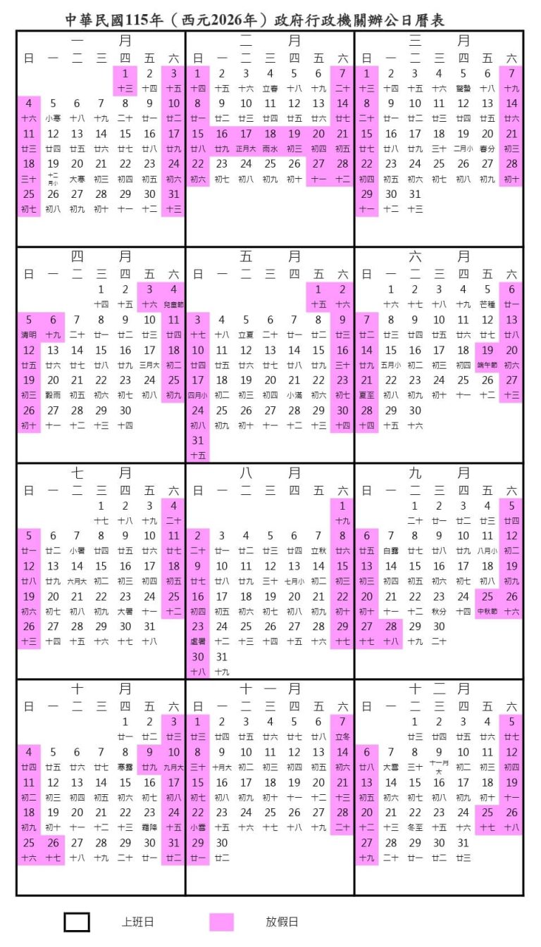 民國115年行事曆(圖取自人事行政總處網站) 2026台灣連續假日日期&行事曆 人事總處發布2026年(民國115年)政府行政機關辦公日曆表 此外,根據最新修正的法案,刪除調整上班日為放假日並補行上班的規定 也就是說以後再也不需要為了因為連假所以彈性放假,之後還需要補班 總放假日數達120天,其中有9個連假,最多為農曆春節假期9天假期 3日以上連續假期有5個,4日以上連續假期有3個,分別 […]…