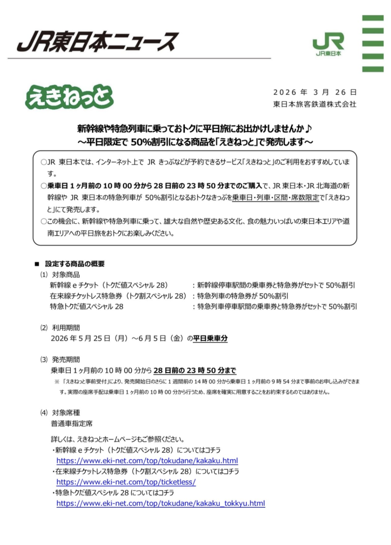 購買管道: 限定只能在 JR 東日本的線上訂票網站「えきねっと(Ekinet)」購買,實體窗口是買不到的喔。